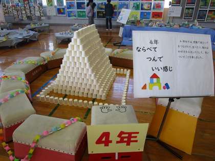 授業では6,000個の紙コップを思い思いに積んだり、つなげたりして楽しみました。積んで塔を作ったり、山を作ったり、万里の長城がごとく長〜〜〜〜い壁を作ったりしていました。
