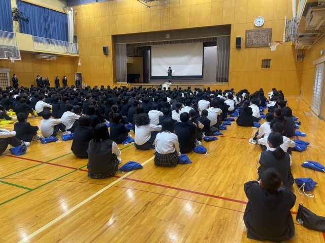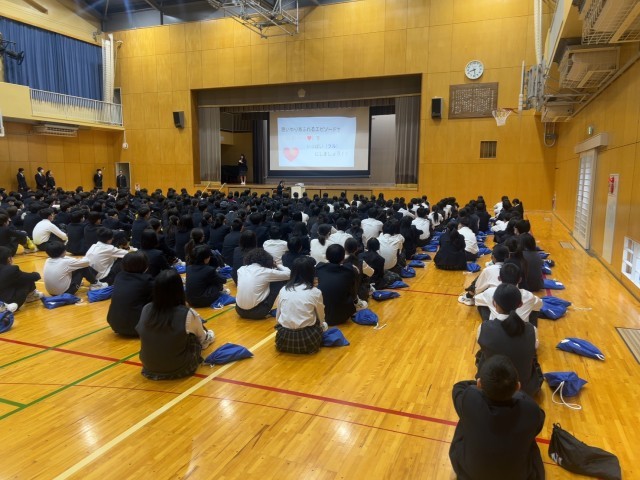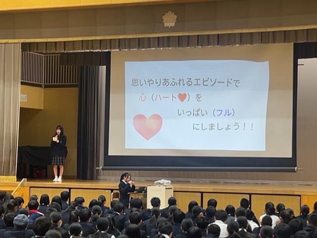 11月25日火曜日は生徒会朝礼を行いました。はじめに生徒会から「#ハートフル郵便Y」についての説明がありました。#ハートフル郵便Yとは、横山中の生徒会と散田小、横山第二小の児童会が企画した取り組みで、心温まる出来事やメッセージを募集し、昇降口に掲示していくものです。続いて、図書委員会から「しおりコンクール」についてのお知らせがありました。しおりコンクールでは、しおりのデザインを募集し、選ばれた作品は、図書室を訪れた人へプレゼントされます。