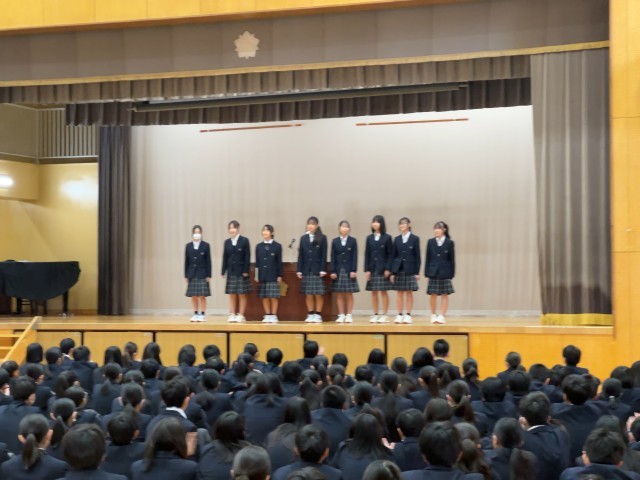 12/16(火)、全校朝礼を行いました。8時25分に整列が完了し、校長先生からの話しがありました。講話の後は税の作文、税の標語、八王子市科学コンクールの表彰をしていただきました。