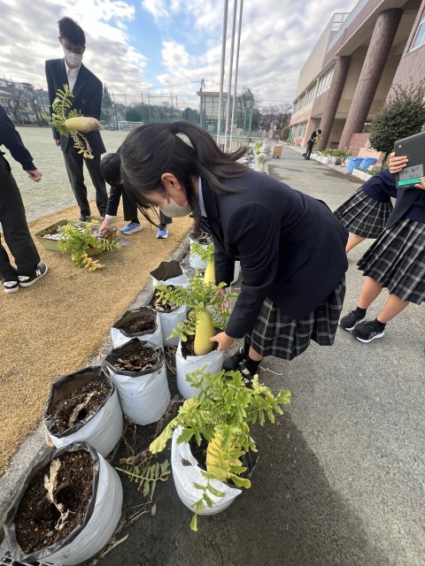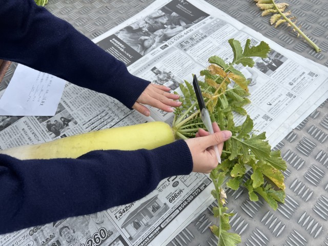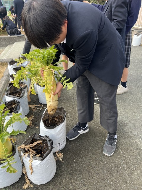 先週から始まった大根の収穫も本日のクラスで全8クラスの収穫が終わりました。大切に育てた大根に愛着がわき「食べられない」という生徒、大根の葉をクシで整えてあげようとする生徒などいました。