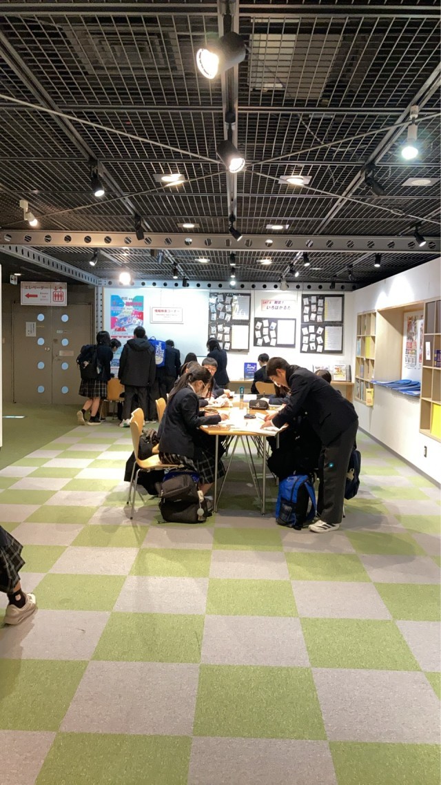 本所防災館で熱心に見学の記録を記入する生徒たち