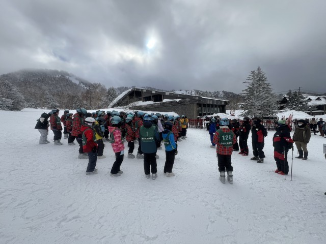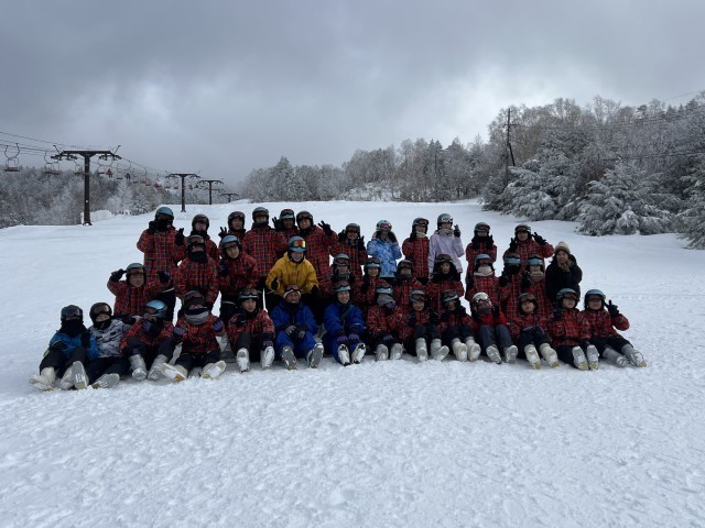 昼食を食べ、スキーウエアに着替え、スキー場へ移動し、各クラスごと写真を撮りました。開校式を行い、参加者全員、スキー教室の講習がスタートしました。
