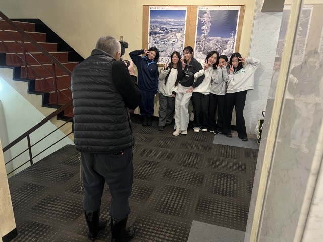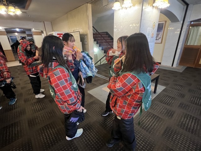 スキー講習後はオレンジジュースが配布されました。その後入浴の時間になりました。短い時間でしたが、熊の湯・硯川温泉の硫黄のにごり湯で、スキーの疲れを癒しました。