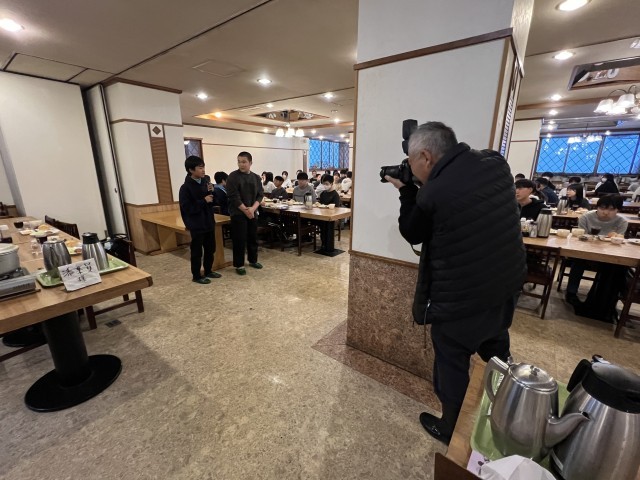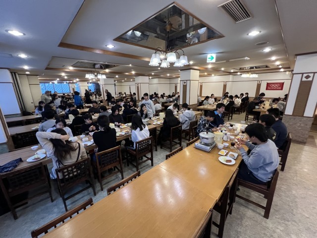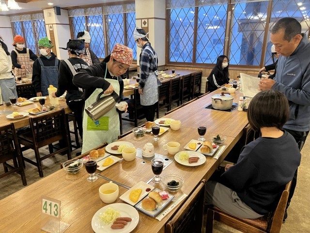 スキー教室2日目がはじまりました。起床後、てきぱきと準備し、朝食にむかいました。みんな元気にもりもり食べていました。午前8時の時点での硯川の気温は-12℃。寒さ対策をして、予定通り、参加者全員で午前の練習にむけて準備しています。