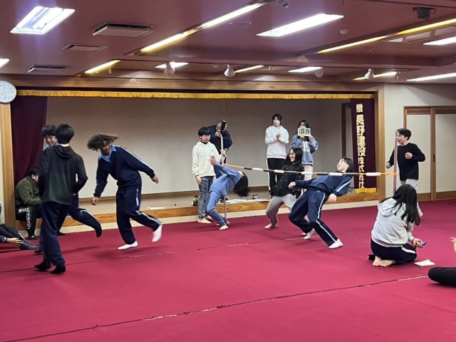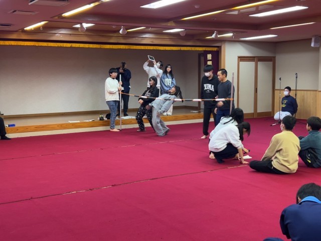 2日目の夜は、学年レクを行いました。初めはクラス対抗リンボーダンスをしました。