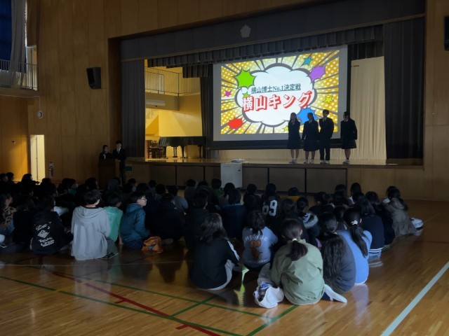 体験授業の後は、生徒会本部役員による学校紹介を体育館で行いました。