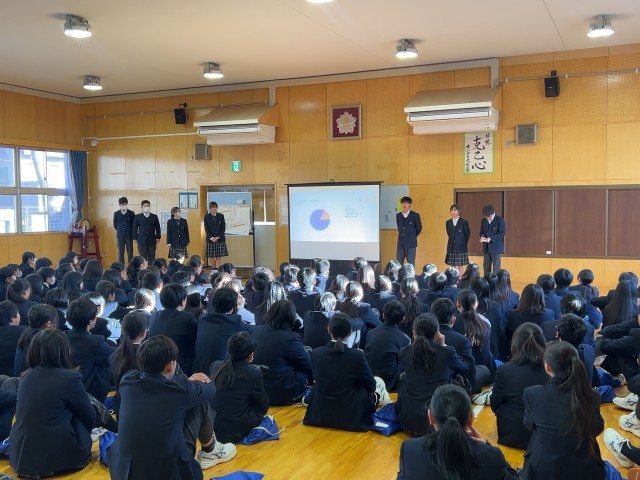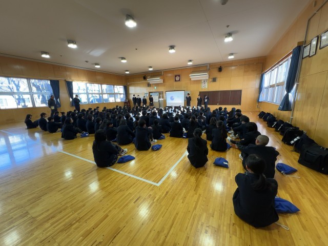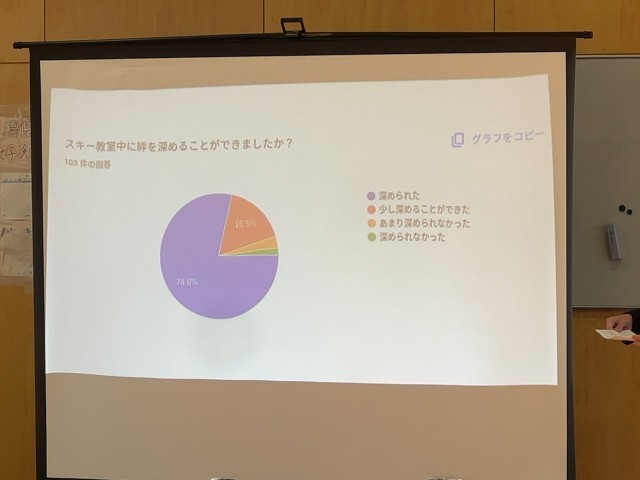 2月3日火曜日の学年朝礼では、スキー教室実行委員から事後アンケートのまとめと一言ずつ、挨拶をしました。スキー実習はもちろん、学年レクでもみんなで楽しみ、絆を深めることができました。「雪にきざめ絆の道」のスローガン通り、志賀高原のパウダースノー、そして、一人ひとりの心に絆を刻むことができたスキー教室でした。