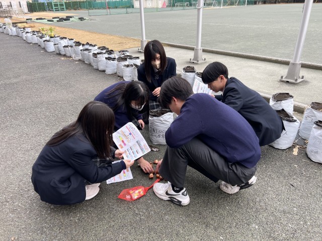 12月末に大根の栽培で使用したコンテナ袋を再利用して、チューリップの球根を植えました。芽が出ると茎や葉を伸ばし、卒業式の頃、花が咲く予定です。2月2日は都立推薦入試の発表です。これからが受験本番です。3年生全員の合格を願っています!