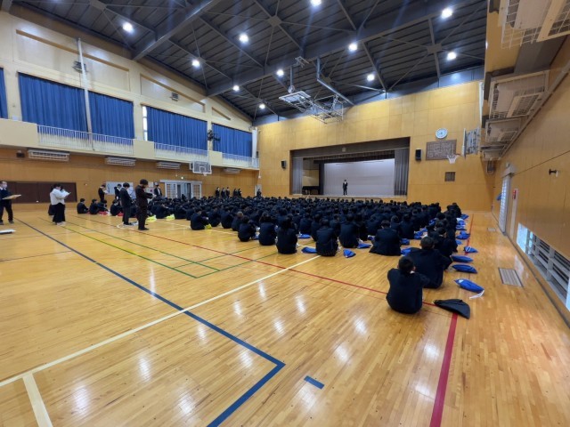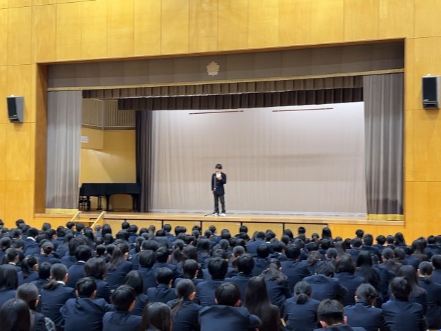 2月17日の生徒会朝礼は、1年生スキー教室実行委員から、スキー教室の報告がありました。先輩方と同じ場所、同じ宿で、一年生も絆を深めることができました。続いて生徒会本部より、ハートフル郵便Yに応募があった心温まるメッセージが紹介されました。