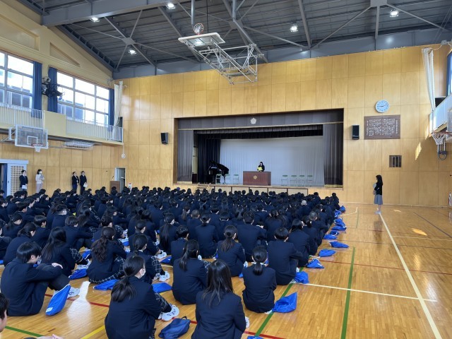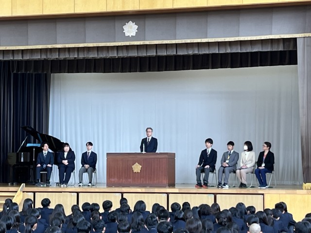その後、体育館で新しく着任した教職員の着任式と始業式を行いました。