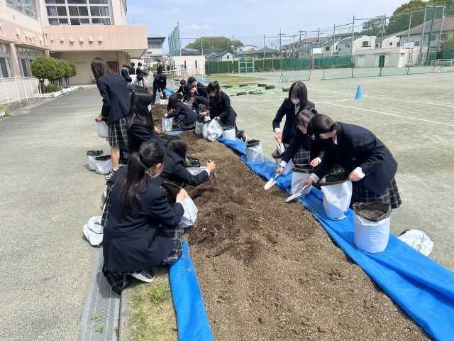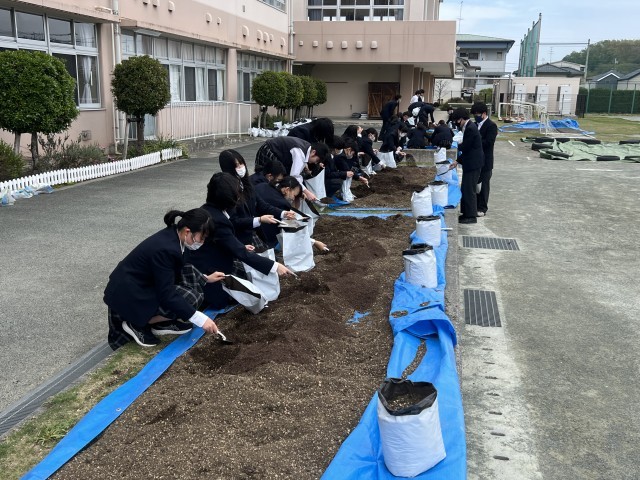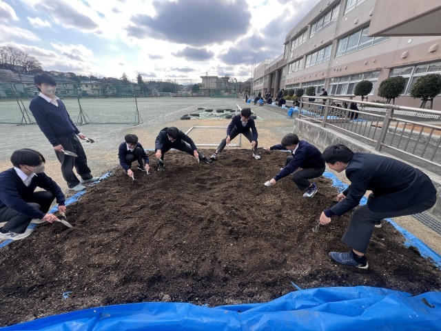 3年生の技術では、ダイコン作りで使用した土を利用して、じゃがいもの栽培に挑戦します。今日は堆肥や腐葉土を混ぜ土作りを行いました。堆肥は、八王子市を通じて地元の企業から提供してくださった「イズミちゃん堆肥」も使用して古土を再生しています。