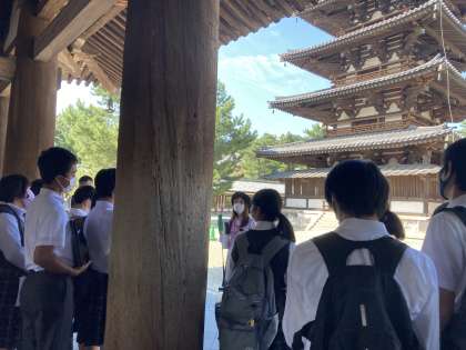 法隆寺に到着しました。記念撮影をしてガイドさんの話を開いています。
