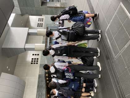 京都駅でタクシーを降り、チェックを受ける生徒の様子です。
