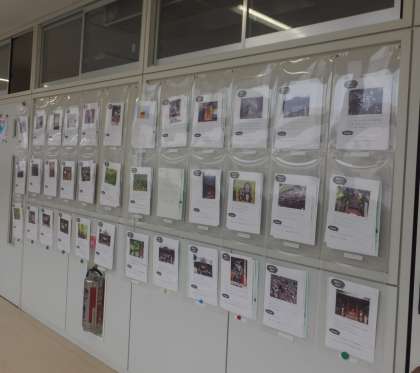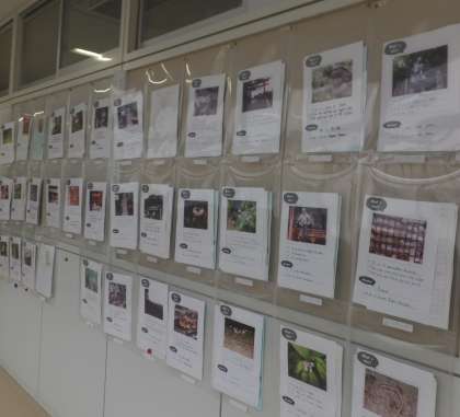 一年生の廊下には、高尾山地域を知る学習の事後学習が掲示されています。事後学習は英語科でも行いました。校外学習中に撮った思い出の写真や植物、動物などを英語で紹介しています。