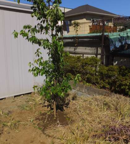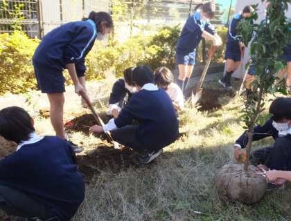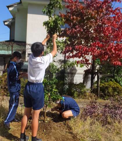 今日の技術科の授業は、2年生と1年生が1クラスずつ植樹しました。