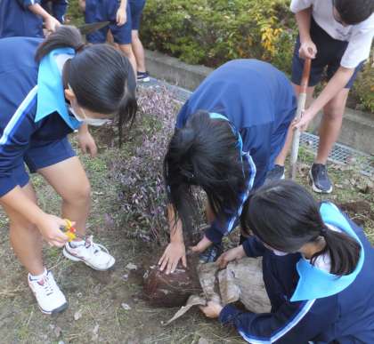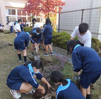 今日の技術科の授業では、1年生が体育館東側にアベリアとリンゴを植樹しました。
