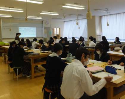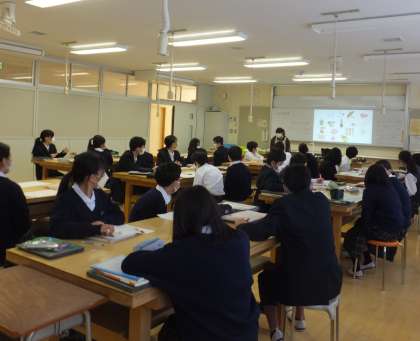 1年生家庭科の授業の様子です。保護者の皆様も興味深く見守ります。食品の種類が電子黒板に映し出されるとこの食品はどんな栄養が含まれているのかと考えている生徒たちです。