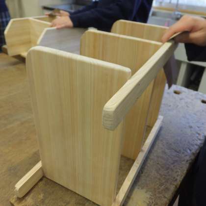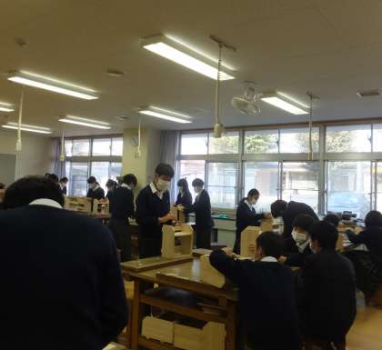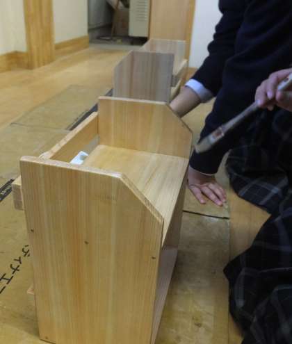 2年生の木材加工作品作りは終盤戦です。やすり掛けやニス塗りをしています。