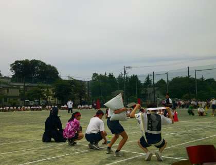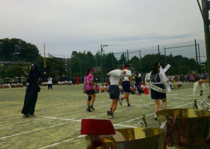 6月6日(火)第75回 体育祭 9 公開日 2023/06/07 更新日 2023/06/07 今日の出来事 第3レーススタートです。ボランティア部は土袋を持ち、剣道部は素振りをしながら進みます。美術部は作成した制作物を身に付けたり、持ったりします。卓球部とテニス部は,トスを上げたりしながらラケットをもって進みます。パフォーマンスをしながらバトンをつなぎます。 いいね(0)