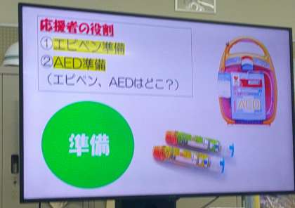 アレルギー対応の必要な生徒の把握と対応を確認し、エピペンの使い方も実習しました。