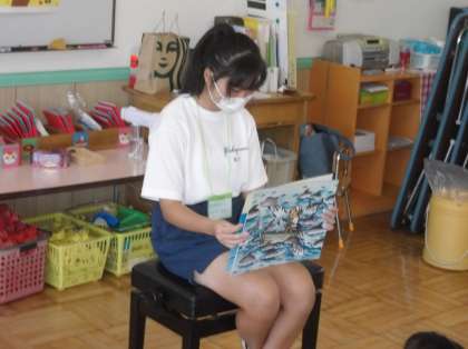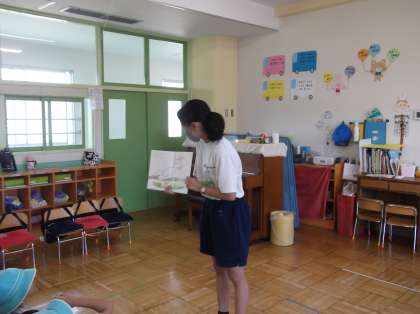 サンライズ幼稚園で園児に紙芝居や読み聞かせをしている様子です。