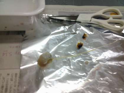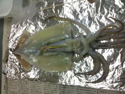 解剖の説明を聞きます。口を開いて王冠とよばれる2つの上下の顎部分をとり、口を引っ張り食道を抜き取ります。その後眼球を取り除き、レンズを取り出して新聞の文字が拡大されるのを見ました。切り開いてイカの性別を確認しました。