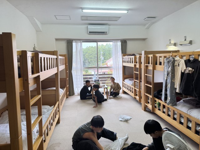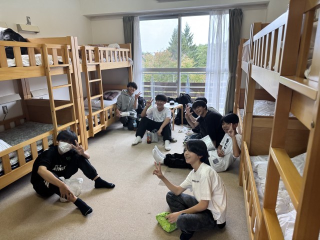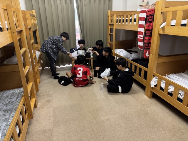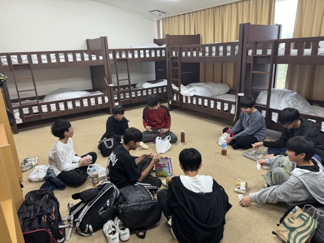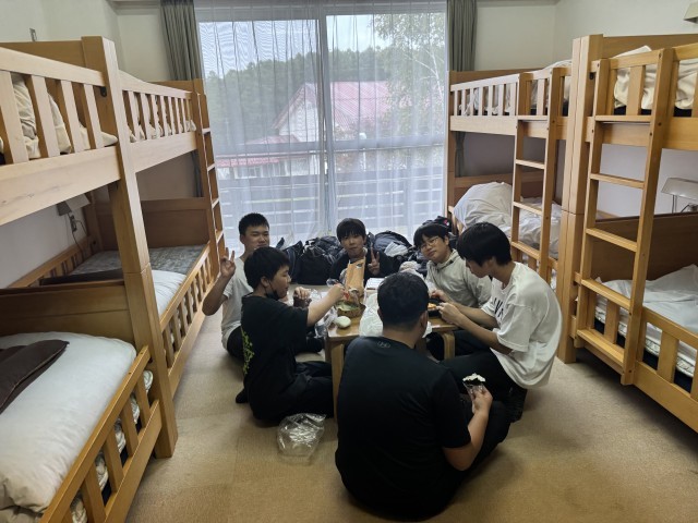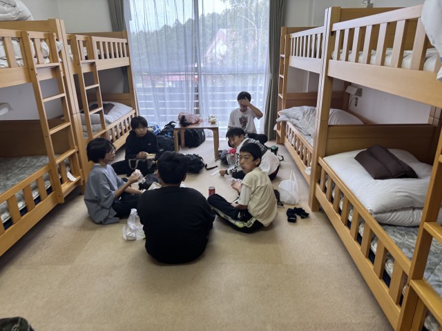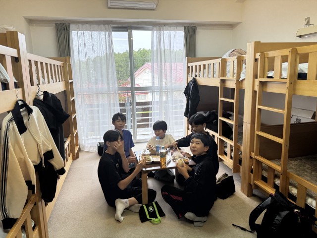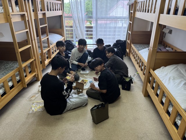 予定より早く宿舎に着きました。少し早いですが、昼食にしてます。保護者の皆様早朝からのお弁当作りありがとうございます。