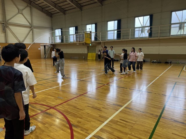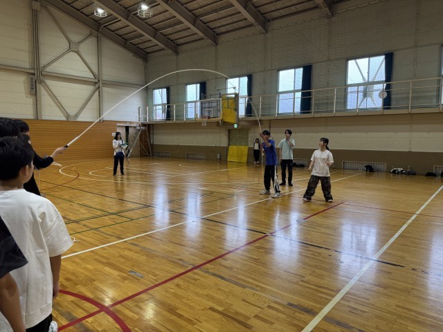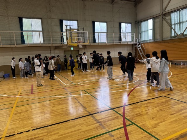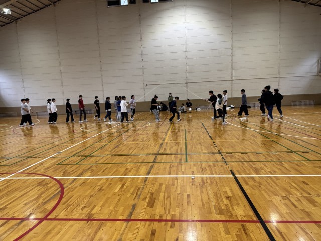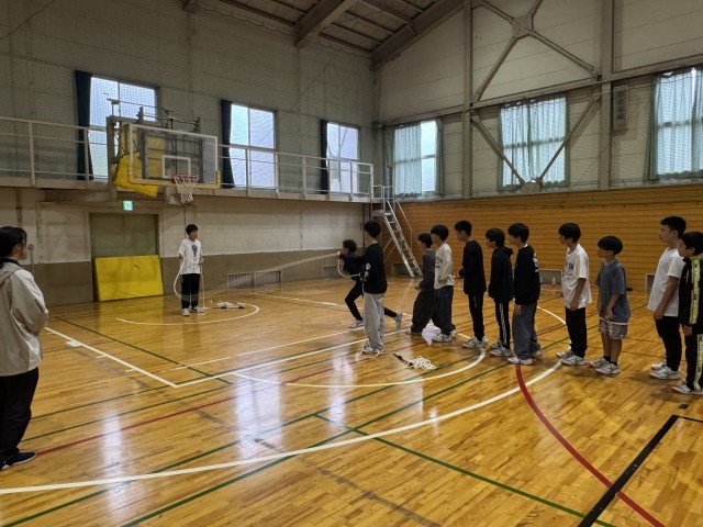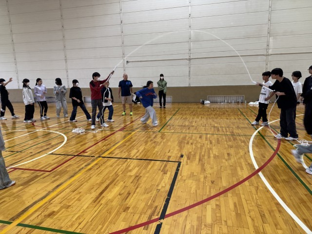 ハイキングが中止になってしまったので、体育館でのレクになりました。最初は、8の字跳びをしました。30分間の練習時間が与えられ、各クラス作戦を考えてました。結果2組が勝ちました。