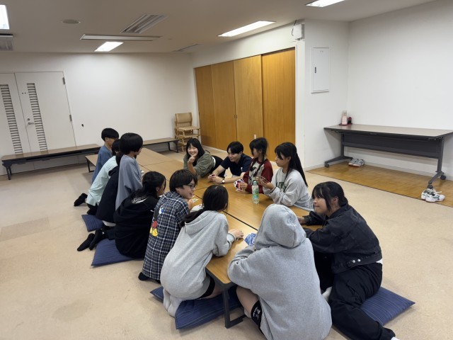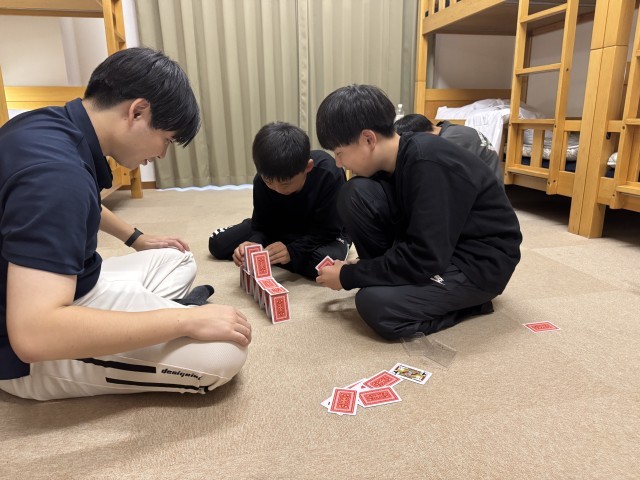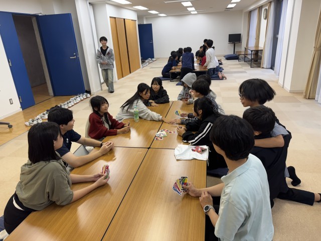 レクのあと宿舎に戻り、部屋や多目的室でカードゲームをしながら過ごしました。