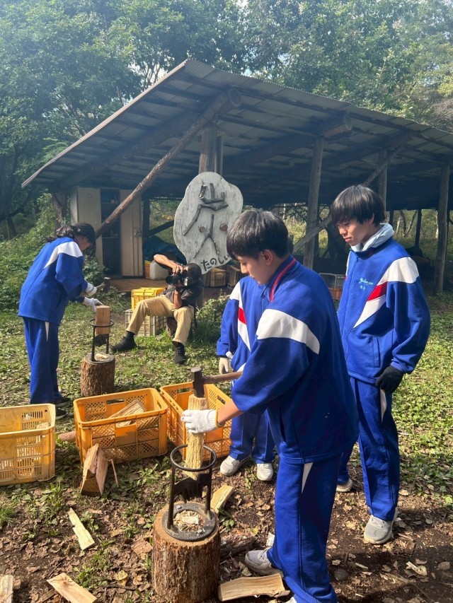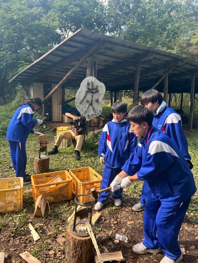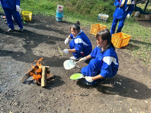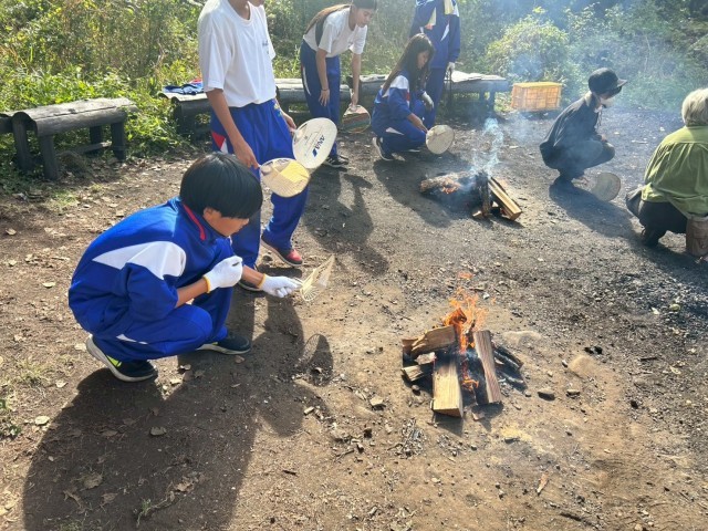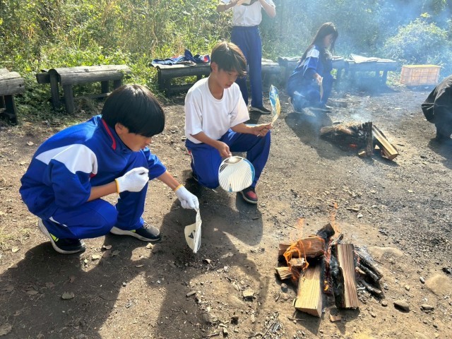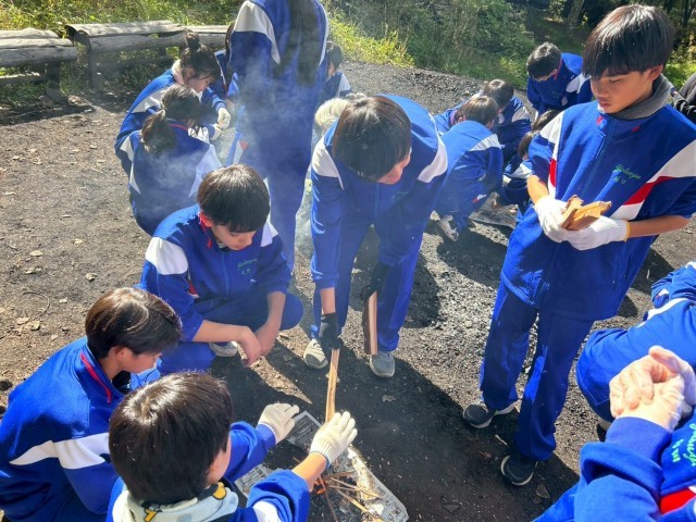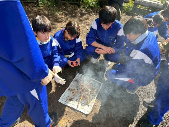 炭焼き体験です。まずは火起こしに悪戦苦闘です。普段の学校ではまず体験することは出来ないと思います。ガスレンジの便利を改めて感じたと思います。
