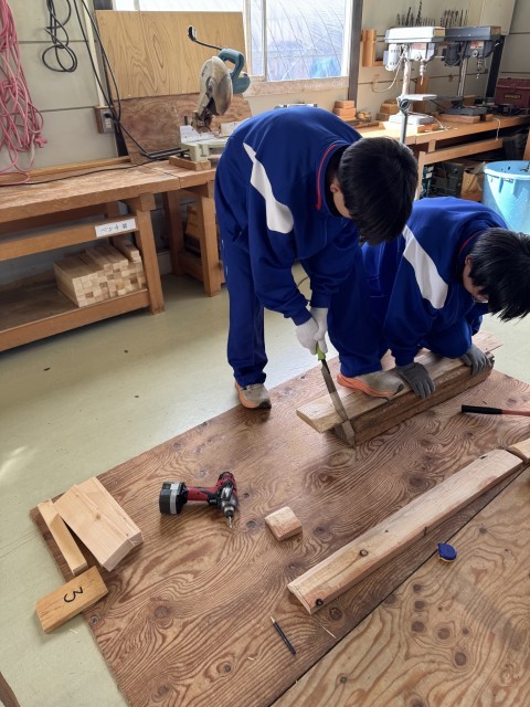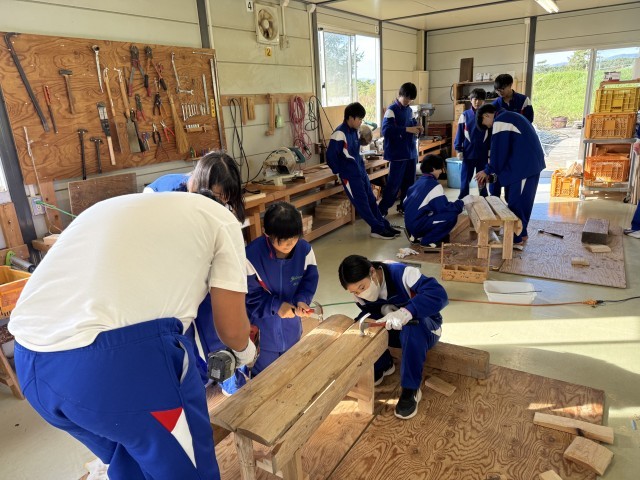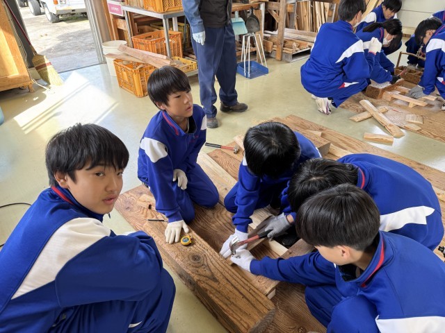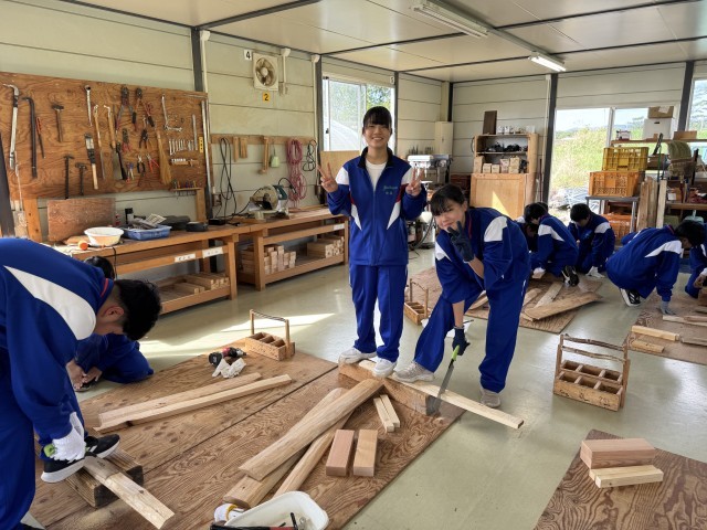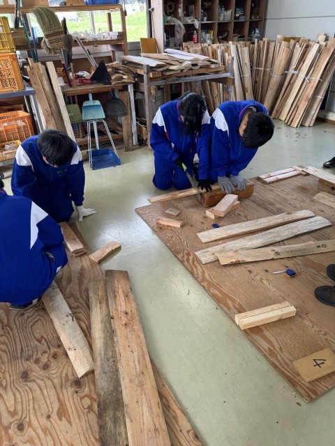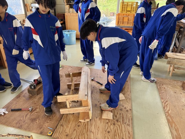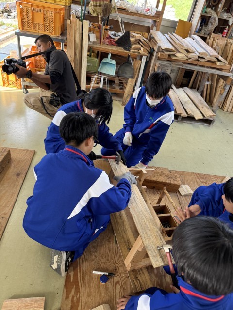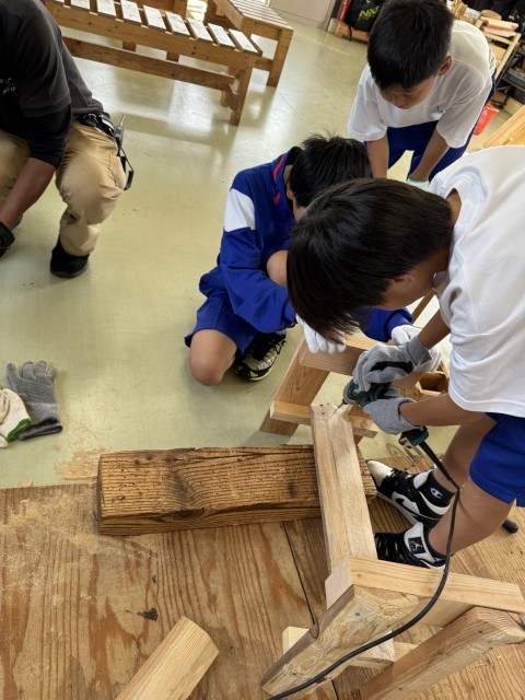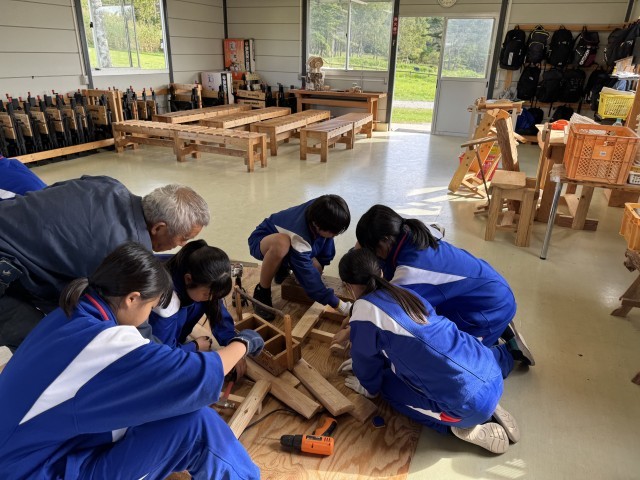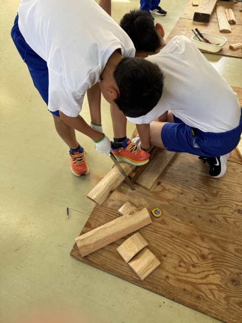 木工の体験です。椅子を作りました。木はとても硬く切ることも、釘を打つことも大変でした。出来あがった椅子は学校に持ち帰ります。楽しみにしていてください。