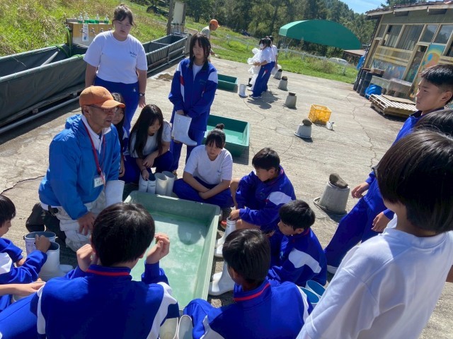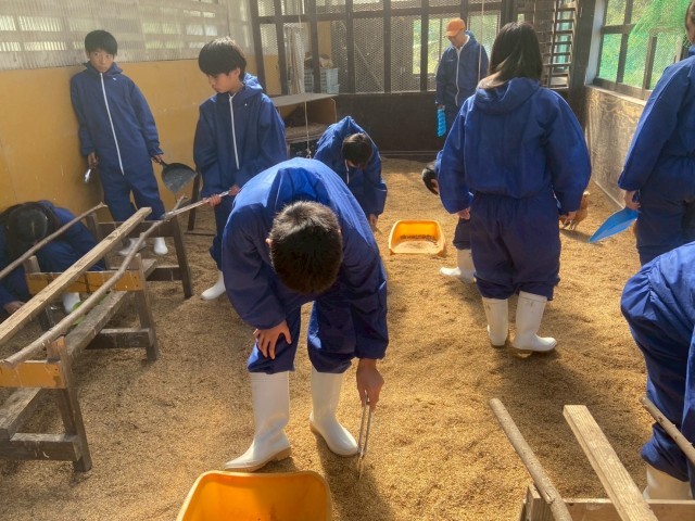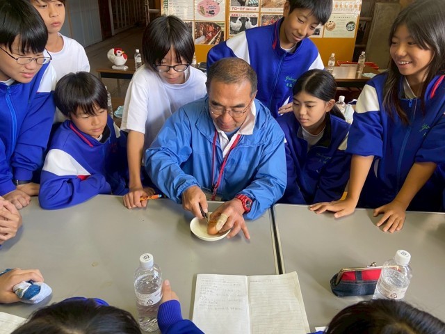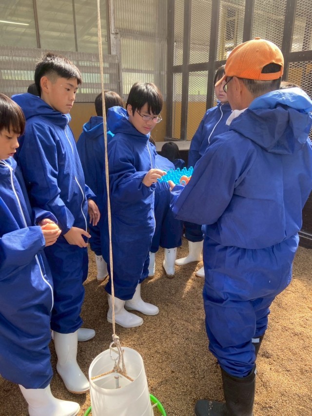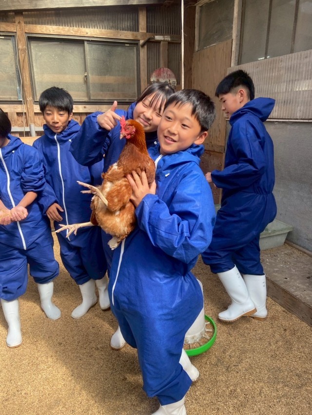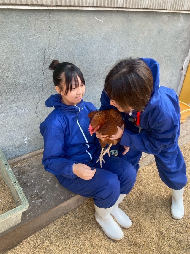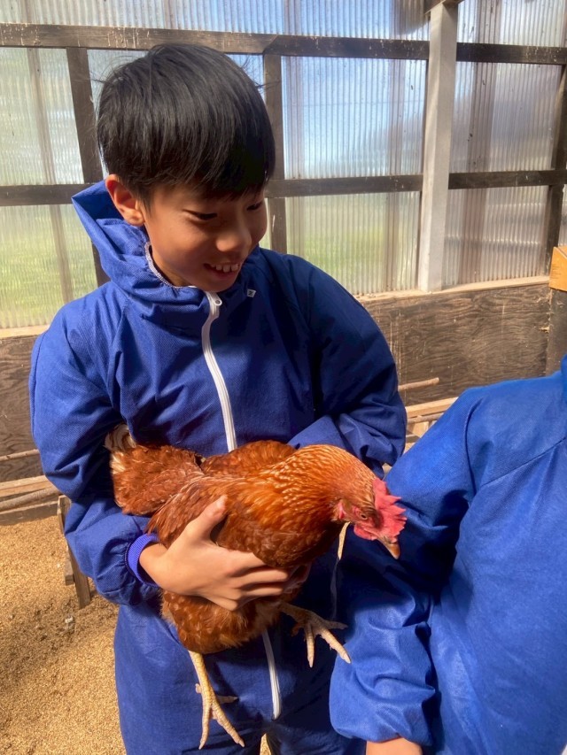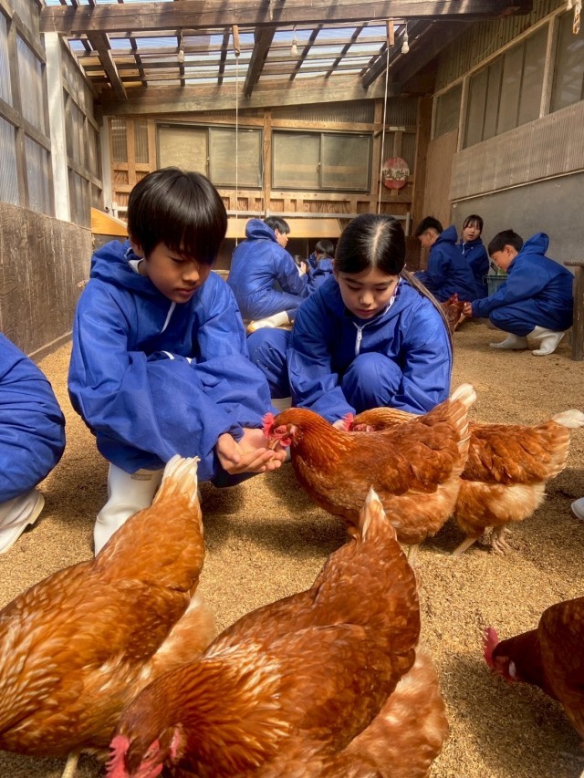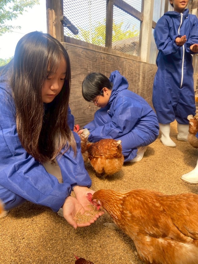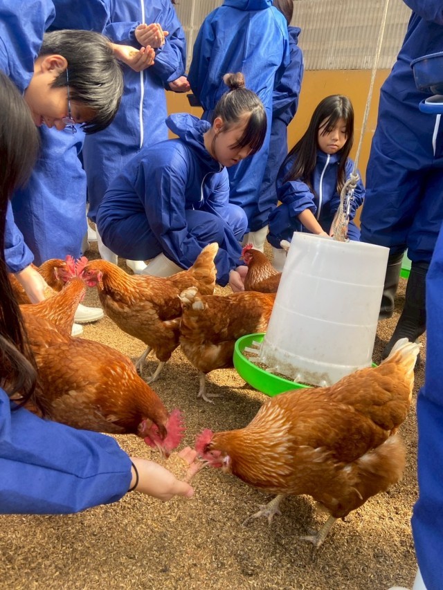 養鶏の体験です。鶏はストレスをかけないために放し飼いにされています。餌やりなどを行いました。