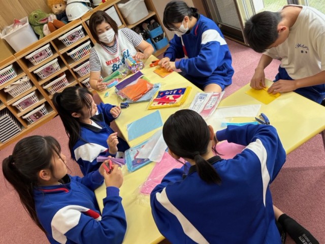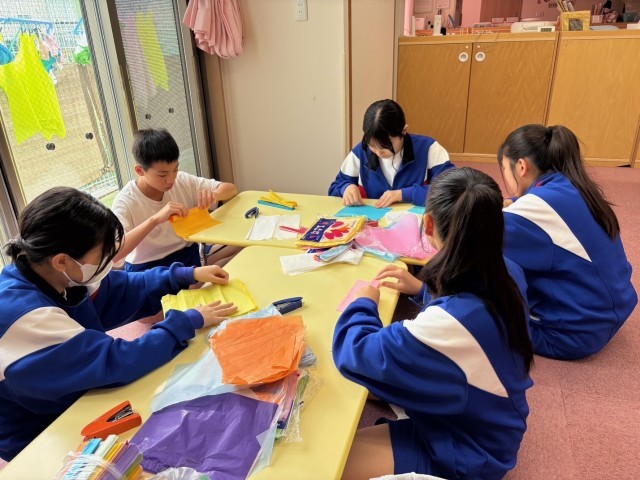 午前中はお散歩へ行き、昼食前には消毒作業に取り組みました。園児たちがお昼寝をしている時間は、園内行事で使用するお花を作成しました。