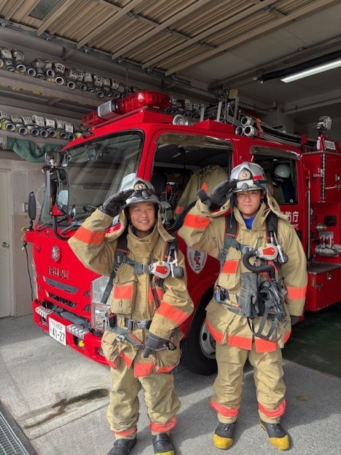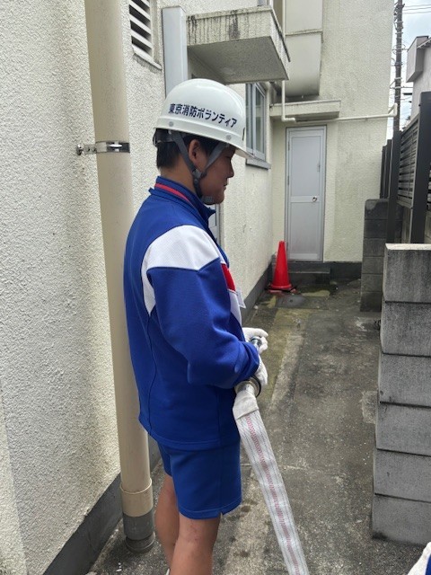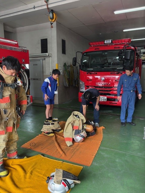 八王子消防署元八王子出張所では、実際に着る防火衣を着用したり、放水の練習を行いました。
