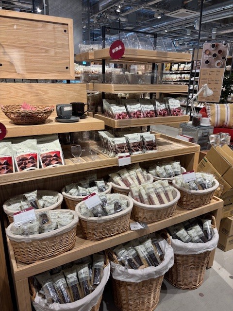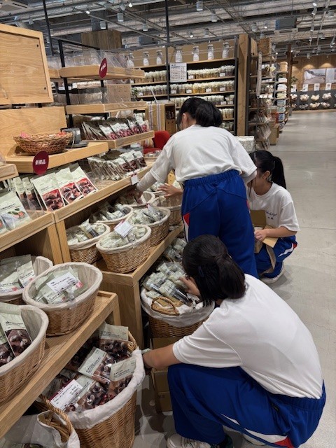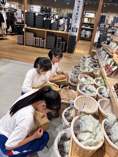 品出しを行っています。三枚目の写真は、自分たちで作った商品棚です。