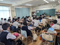 5,6校時は3年生は武道場と図書室で防災講和(意識、安全確保、緊急時への備え)を聞き、簡易担架の作り方や簡易トイレの備え、火災の時に消火のために使うスタンドパイプの接続方法、放水のしかたやバケツリレーについて学びました。