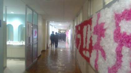 校舎には生徒会(2・3年生)、美術部、卒業生から新入生歓迎の装飾が施されています。