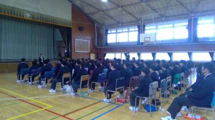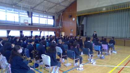 1校時は体育館で学年集会があり、学年の先生の紹介と年間予定、生活と学習について話がありました。