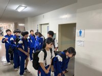 学校給食センターの職場体験の様子です風で体を洗浄し、腕まできれいに洗い、作業に取...