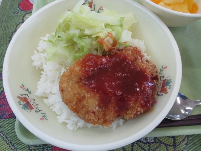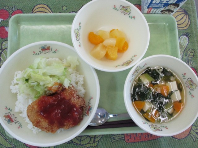 給食では、トンカツを揚げて、たっぷりのソースをかけて