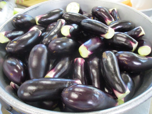 つやつやの秋ナスをいちょう切りにして、油で炒めておき、