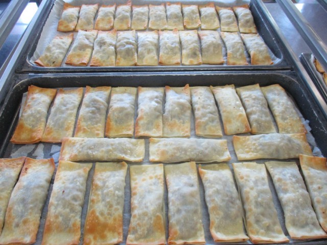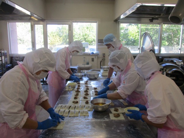 朝から餃子の具を練り合わせて、餃子の皮で棒状に包んで、上に油をぬってから