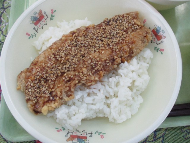 カラッと揚げたさんまに、ごまだれをかけてできあがりです。