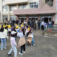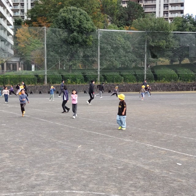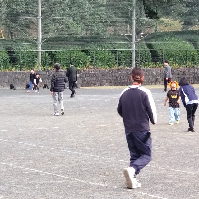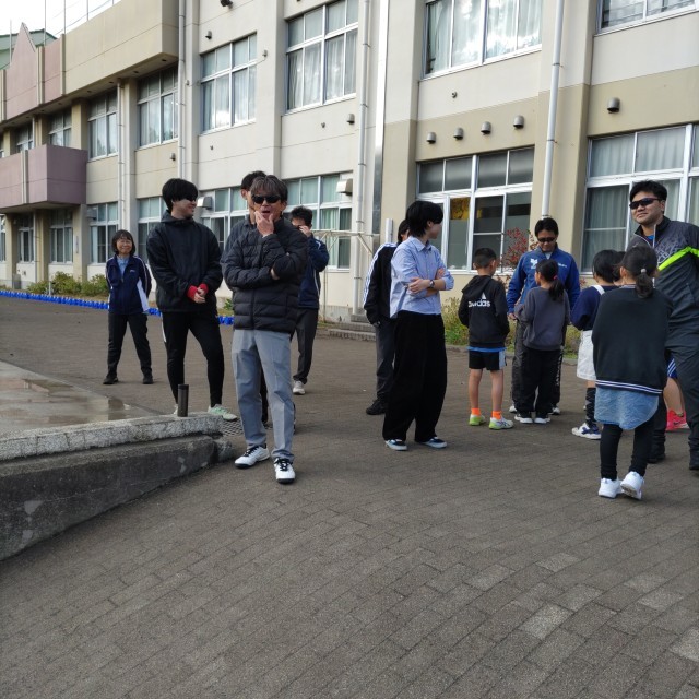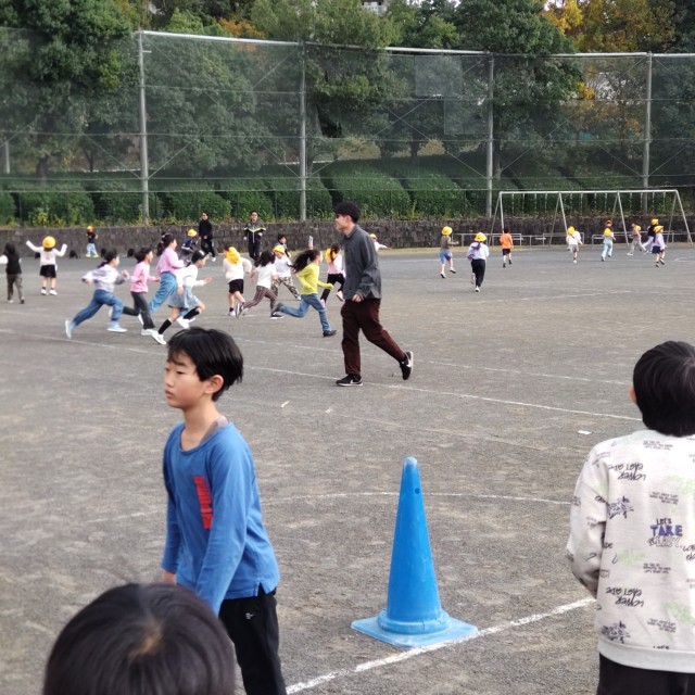 鑓水中学校の先生方がハンターとなり、逃走中が始まりました。ゲームマスターも来てくれました。みんな一生懸命ハンターから逃げていました(^^)