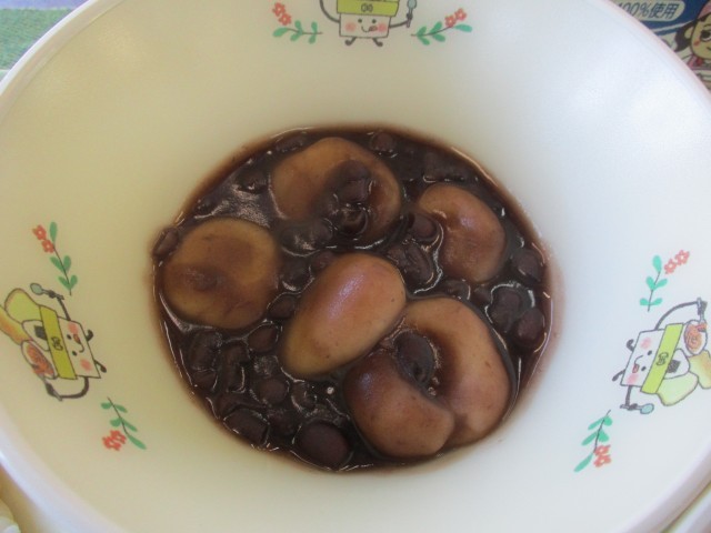 今日は、小豆を甘く煮て、1つ1つ丸めてゆでた白玉だんごを入れた