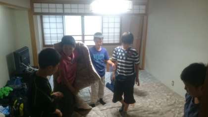 もう布団を敷いてる班