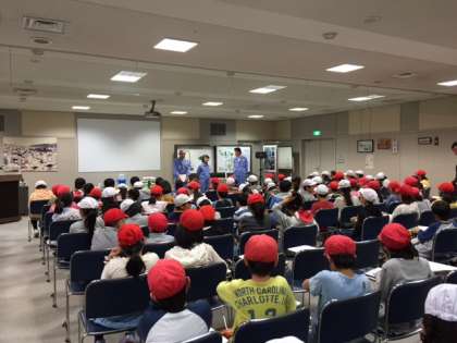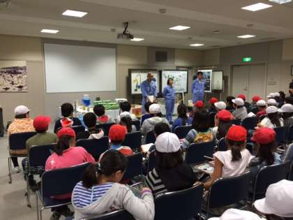 中央防波堤埋め立て処分場に到着しました。10階のホールでお話を聞いています。