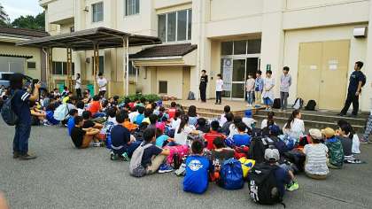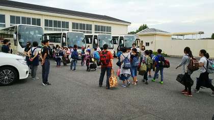 おうちの方や職員に見送られて6年生が元気に出発しました。少し天候が心配ですが、2泊3日楽しい思い出をたくさんつくってくれることを期待してます。行ってらっしゃい!