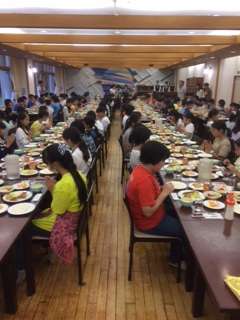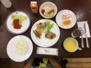部屋でハガキを書いて過ごした後は、お楽しみの夕食です。いわゆる“合宿飯”ではなく、“ホテルの夕食”です。フォークとナイフは、上手に使えるかな? いっただっきまーす♪
