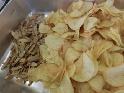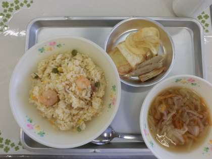 今日はアメリカ南部料理のジャンバラヤです。えびやトマト、ベーコンなどが入っていてスパイシーな味つけが特徴です。給食ではチリパウダーを入れて香りをつけました。野菜チップスは今が旬の新じゃがと新ごぼうを素揚げして作りました。焦げないように注意しながらおいしく調理員さんが揚げてくれていました。